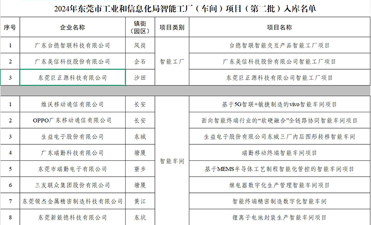 7月1日,东莞市工业和信息化局公布了2024年东莞市工业和信息化局智能工厂(车间)项目(第二批)入库名单。东莞巨正源科技有限公司凭借在数字化转型和智能制造领域的创新实践与显著成效,获评为“东莞市智能工厂”。